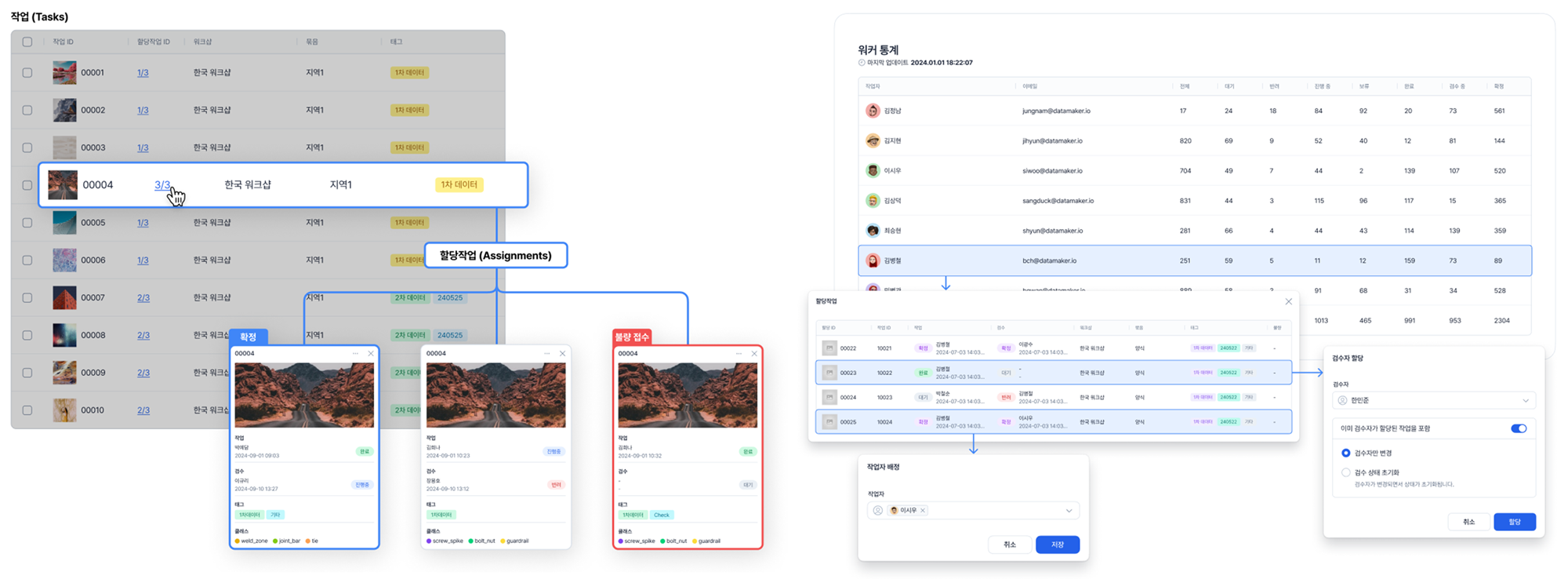 대규모 작업자와 다수의 워크샵을 동시에 운영할 수 있도록 작업의 분배(할당 작업)/진행 현황을 통합 관리