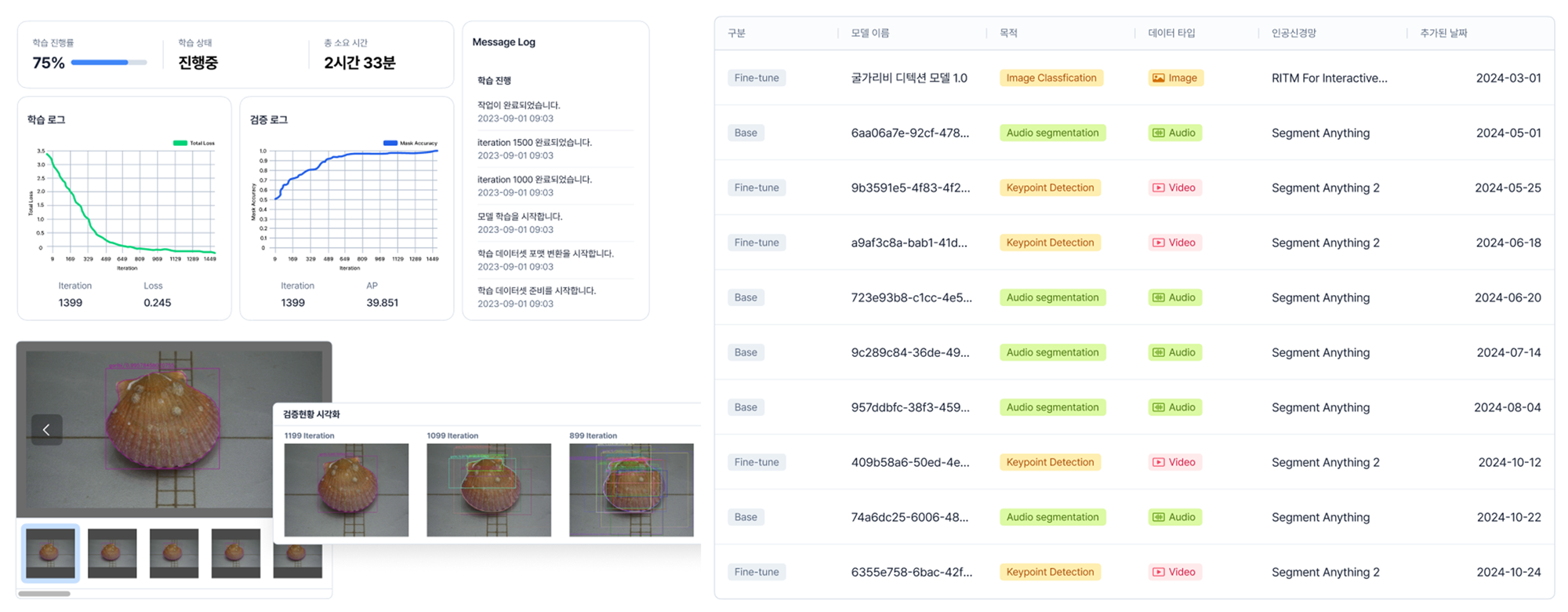(좌) 학습 상세 페이지, (우) 학습된 모델 목록 페이지