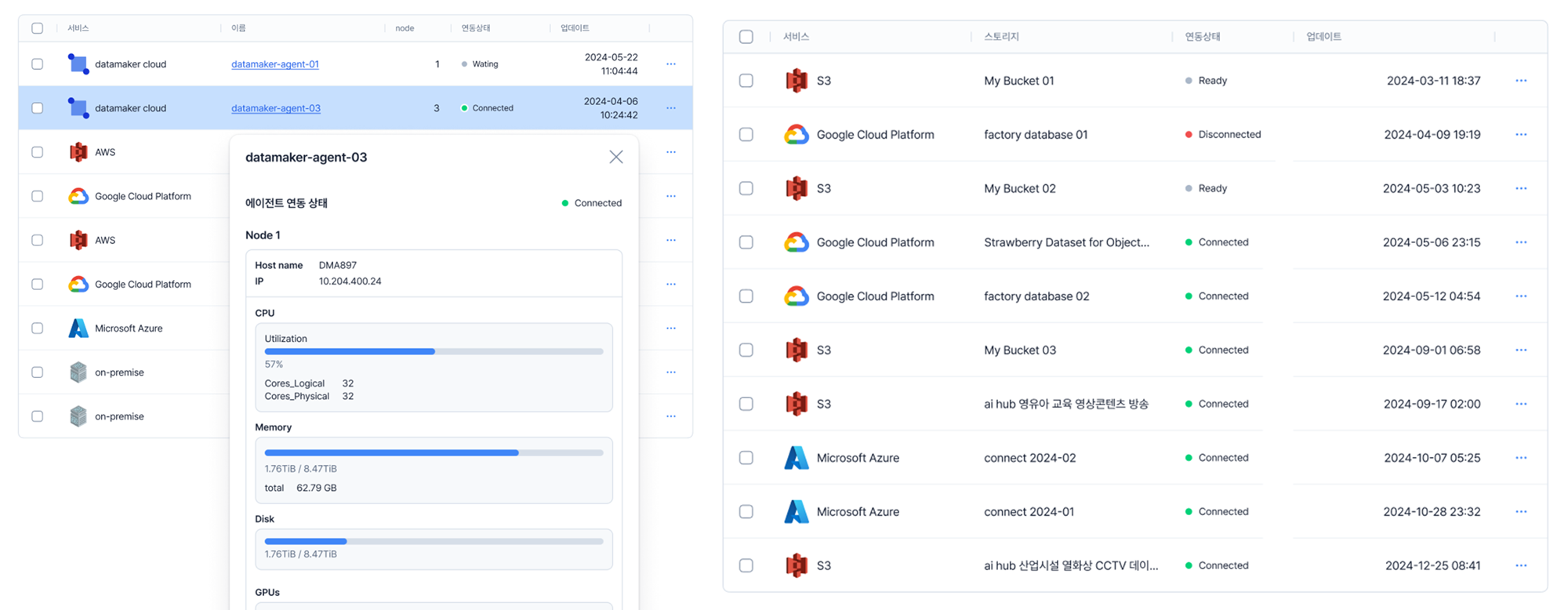 (좌) 에이전트 연동 현황, (우) 연동된 스토리지 목록