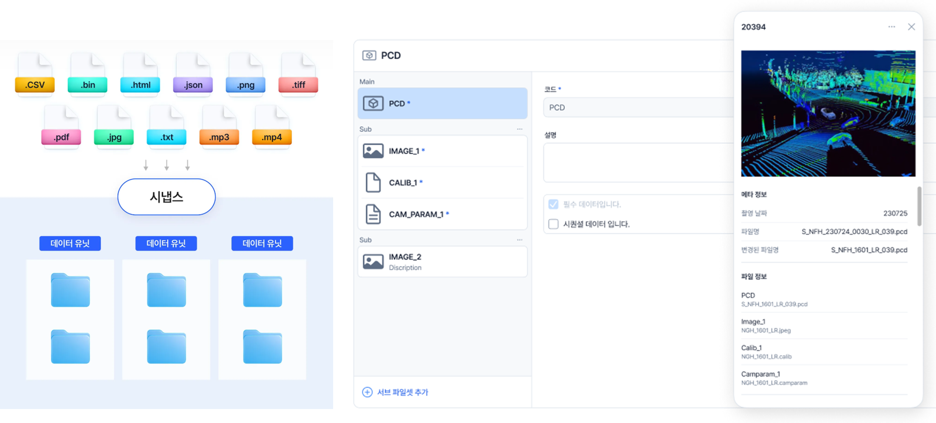 (좌) 시냅스가 지원하는 다양한 데이터 포맷 유형 , (우) PCD 컬렉션 데이터 유닛구조 창