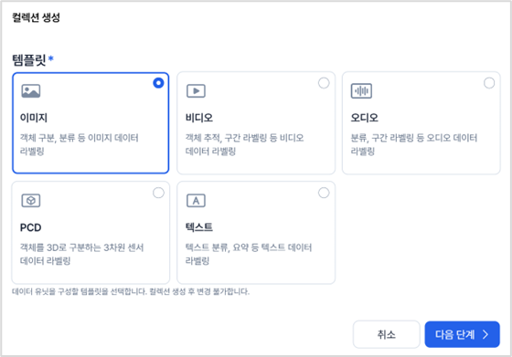 ※ 컬렉션 생성 후에는 템플릿 변경이 불가합니다. (템플릿은 데이터셋을 구성하는 데이터의 유형을 의미하며 이미지, 비디오, 오디오, PCD, 텍스트 등을 선택할 수 있음)