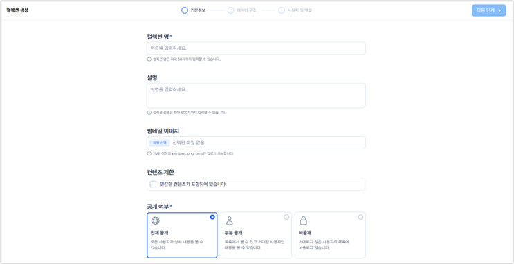 ③ 생성할 컬렉션의 기본 정보를 입력하고 다음 단계버튼을 클릭합니다.