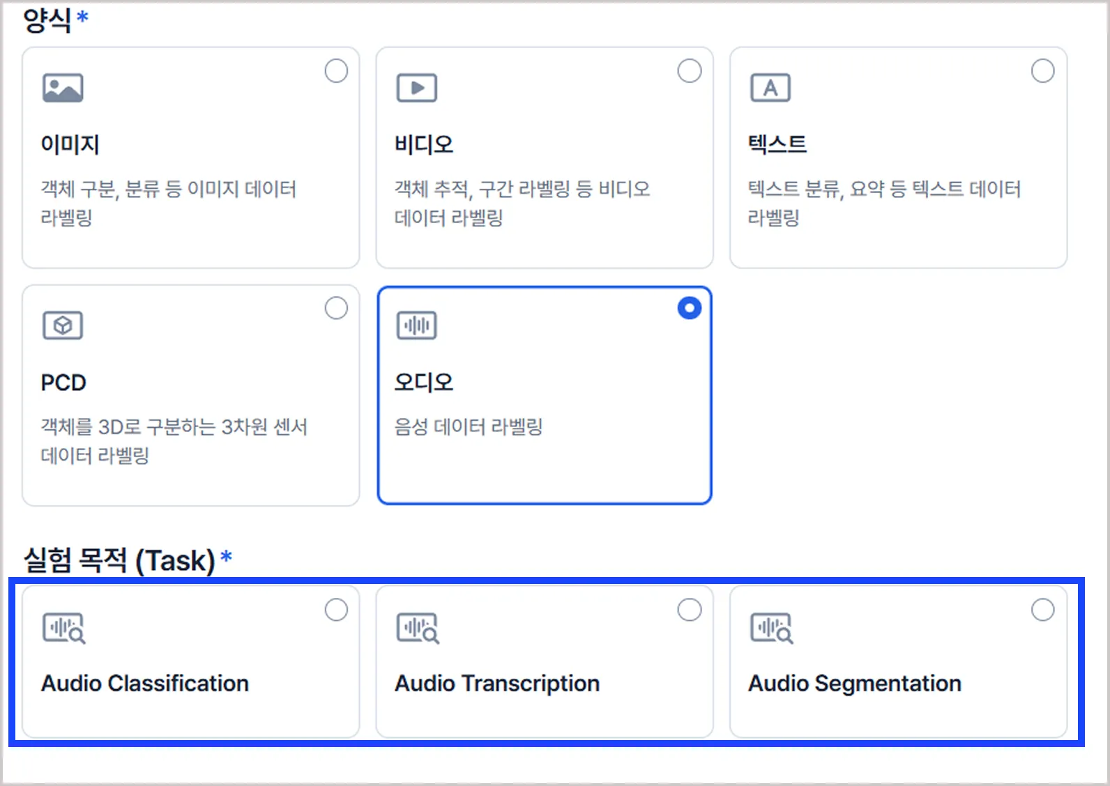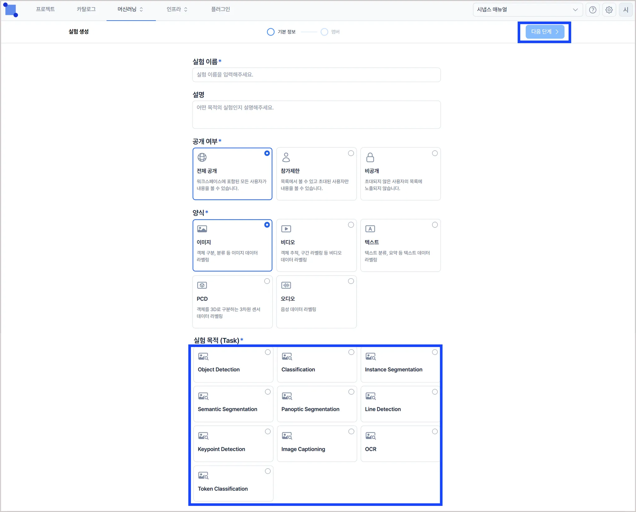 양식 : 실험에 사용할 데이터 타입을 선택합니다. (이미지, 비디오, 텍스트, PCD, 오디오)