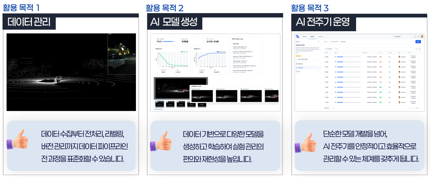 - 머신러닝 : 다양한 인공지능 모델 학습을 위한 실험(Experiment)을 생성하고, 각 실험 내 학습(Training) 과정을 통해 모델 개발과 성능 비교를 체계적으로 관리하는 모듈을 의미합니다.