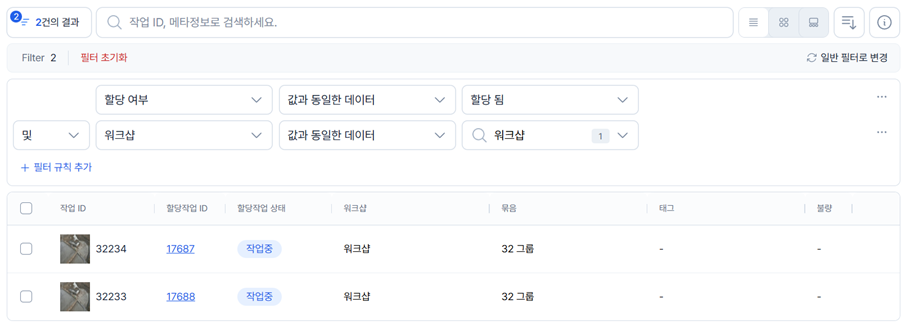 ③ 완료 확정/취소, 작업 상태 변경, 검수 초기화, 태그 적용/삭제, 할당 작업 삭제, 작업 검토 기능은 워크샵 내 할당작업 관리 페이지와 동일하게 제공됩니다.