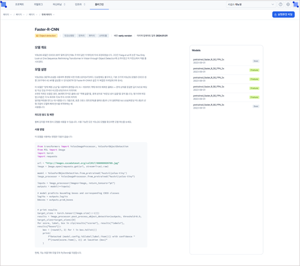 페이지 우측의 Models 항목에서 해당 플러그인의 기본 탑재 모델인 Base Model과 베이스 모델을 통해 학습시켜 내부에 등록한 모델이 Finetune Model의 리스트를 확인할 수 있습니다. 또한, 상단의 실행환경 파일 버튼을 통해 해당 플러그인 버전에 필요한 환경 설정 정보가 담긴 TXT 파일을 확인할 수 있습니다.