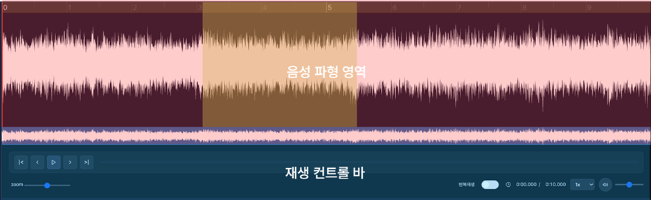 오디오 라벨링 시 데이터의 특성을 반영하여 에디터에 추가적인 영역이 나타납니다. 이 영역은 미니맵, 재생 컨트롤 바, 라벨링 영역으로 구성되어 있습니다.