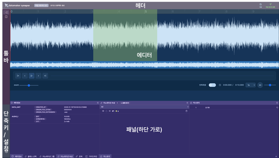 오디오 어노테이터는 헤더, 에디터, 툴바, 패널, 설정 및 단축키로 구성되어 있습니다.
